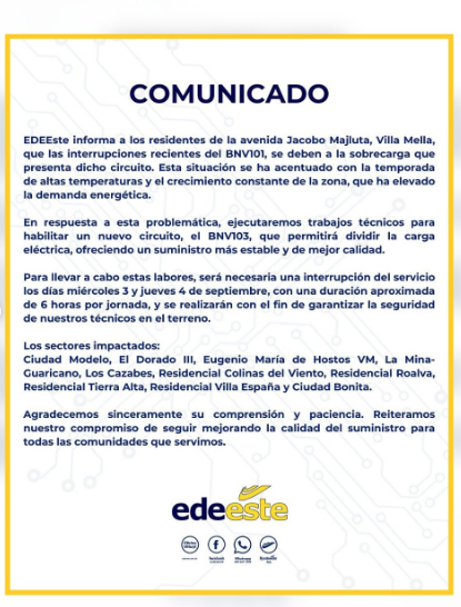 La Empresa Distribuidora de Electricidad del Este (EDEESTE) anunció la suspensión del servicio eléctrico en la Jacobo Majluta, entre el miércoles 3 y jueves 4 de septiembre en horario de 9:20 de la mañana a 5:20 de la tarde. Esto con el fin de reparar el circuito BNV-1.